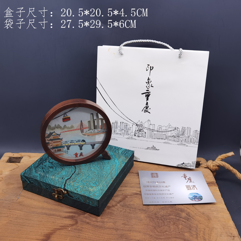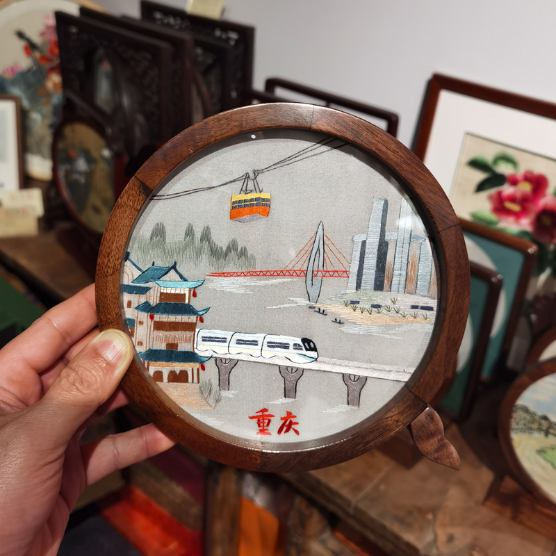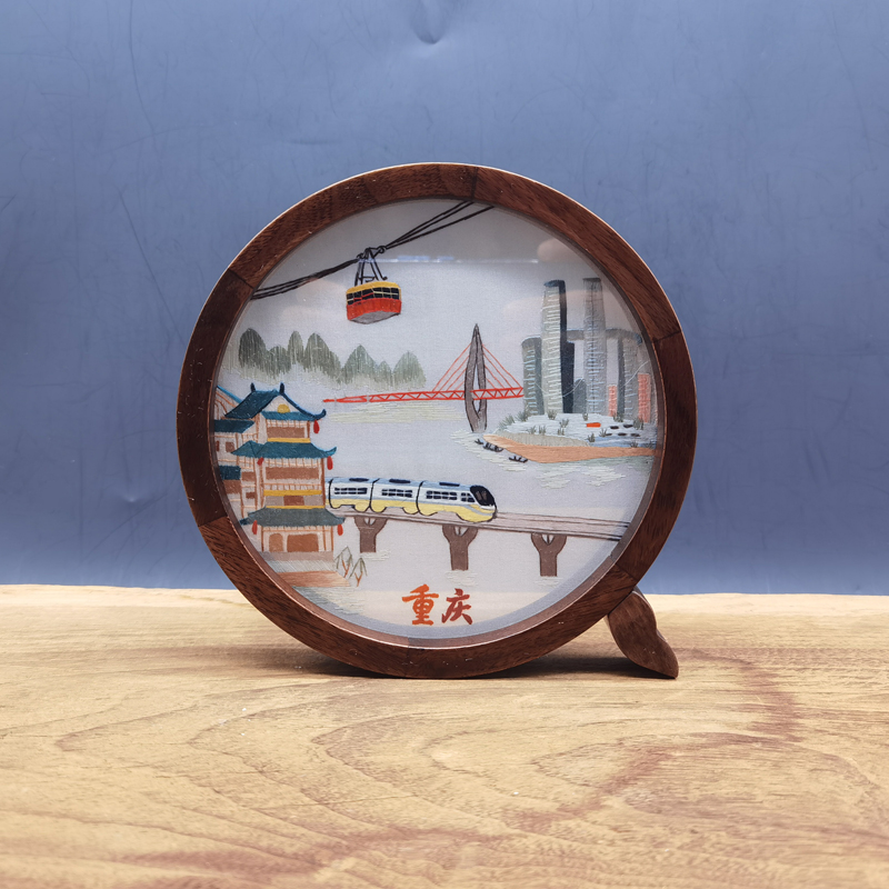 蜀绣渝城印象迷你胡桃木Q框摆件