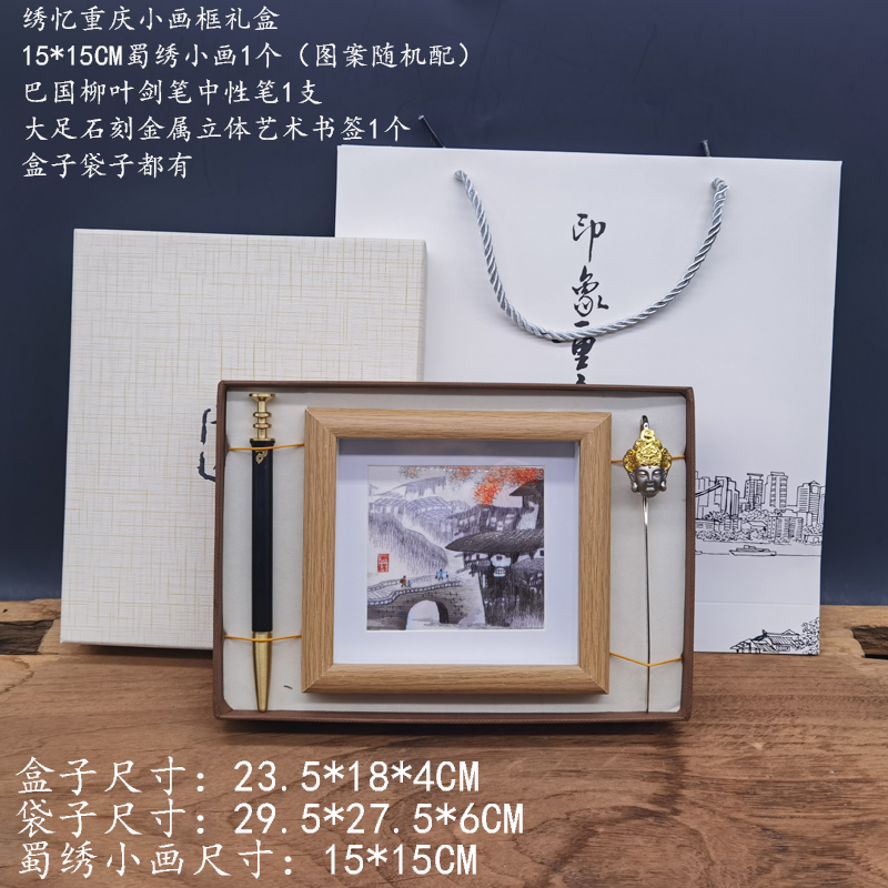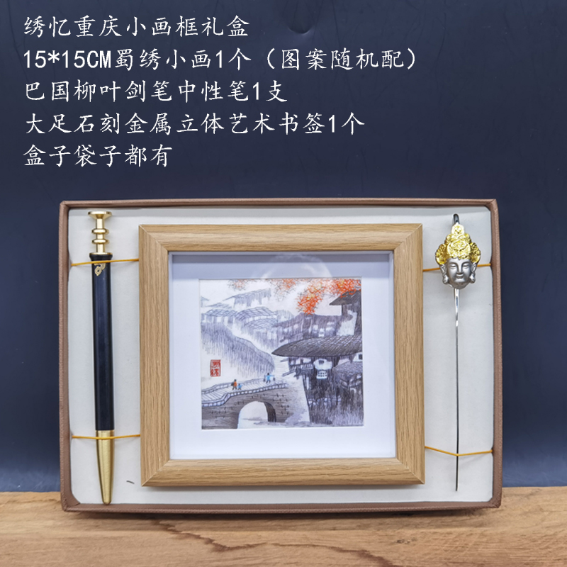 绣忆重庆蜀绣15X15CM小画框组合+柳叶剑笔+大足石刻书签